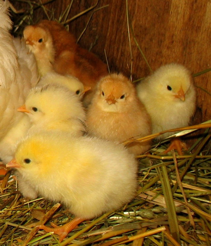 Es sind acht kleine Kücken geschlüpft. Ihre Mutter die Henne Frieda passt sehr auf sie auf.