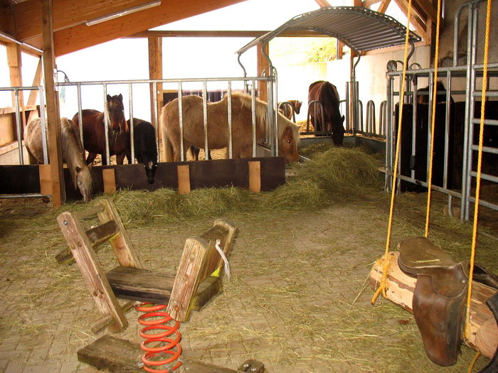 In den Wintermonaten hat sich der neue großzügige Offenstall für unsere Ponys bestens bewährt. Die Kühe können jetzt sogar die tolle Aussicht auf der Terasse genießen. Hier können die Kinder im Trockenen die Ponys und Kühe beobachten bzw. die Hasen und Ziegen im Freilaufstall füttern.