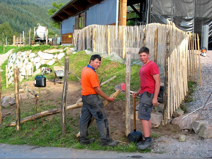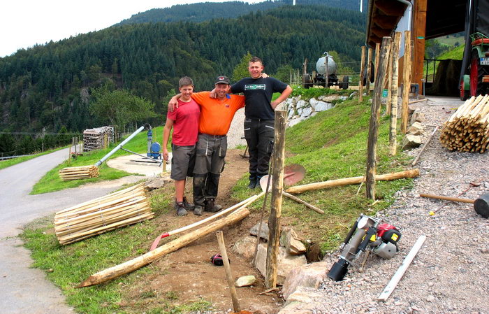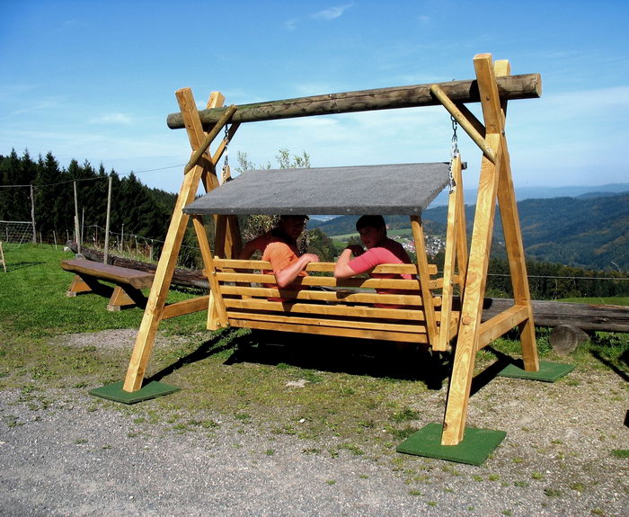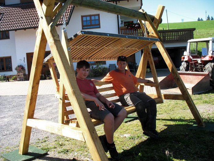 Bauer Roland und Simon haben für unsere Gäste eine tolle Hollywoodschaukel gebaut. Das Holz stammt aus unserem Wald und für die Dachkonstruktion wurde ein alter Lattenrost verwendet.