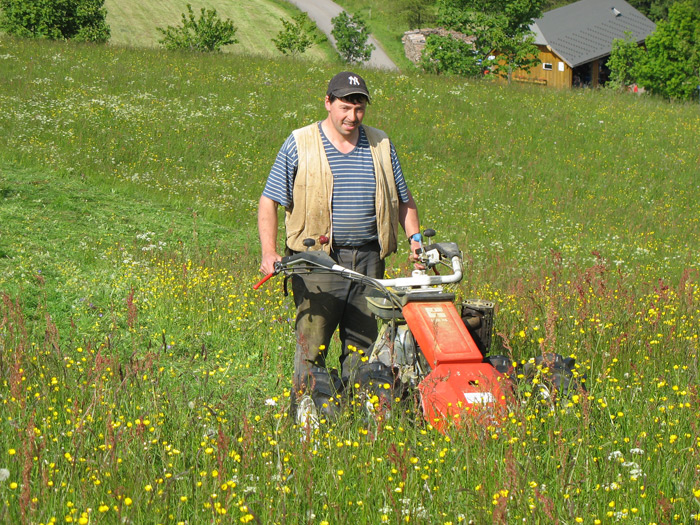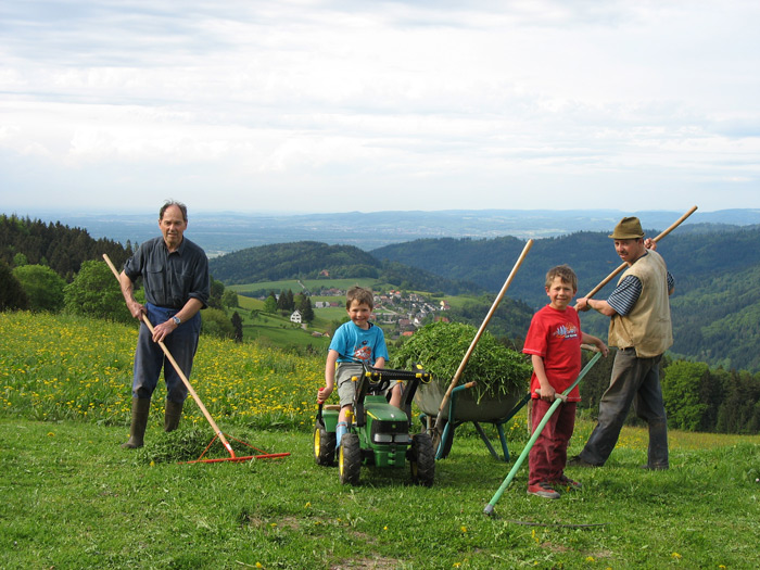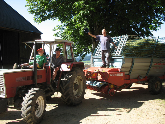 Unser Hof ist ein reiner Grünlandbetrieb mit Mutterkuhhaltung, den wir im Nebenerwerb bewirtschaften. Hier werden die Kühe von ihren eigenen Kälbchen „gemolken“. Wir haben Kühe, Pferde und Ponys sowie viele Kleintiere wie die kleinwüchsigen Zwergziegen "Lotte" und "Wilma", Katzen (oft auch Babykätzchen), Minischweinchen "Berta", Zwergwidderhäschen, Meerschweinchen, viele Hühner und Küken ...